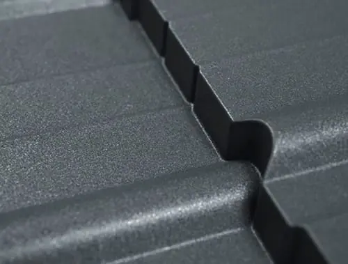 Изготавливается на качественном оборудовании, поэтому листы максимально точно прилегают друг к другу. Точность геометрии гарантирует, что в местах стыков металлочерепицы не проникнут осадки.