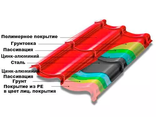 Многослойность структуры металлочерепицы обеспечивает ее долговечность. Верхнее полиуретановое покрытие не боится жары, холода, влаги и солнечных лучей. Дополнительно надежность обеспечивает алюцинковый слой, который наносится на металлическое основание листа. Покрытие Galfan (ZA265) практически не восприимчиво к процессам ржавления, что делает его на порядок устойчивее цинкового.