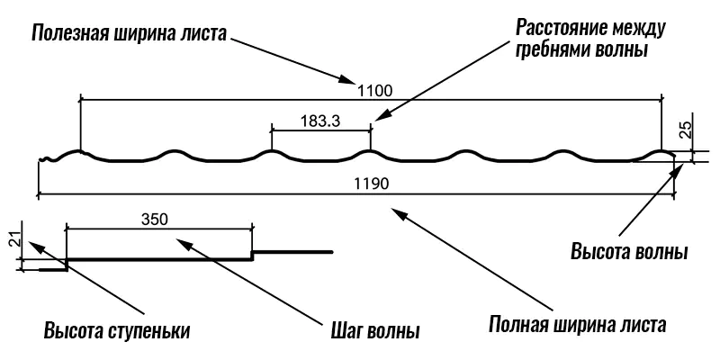 Высота ступеньки измеряется как расстояние между гребнем и прогибом волны. Этот параметр не влияет на количество листов, необходимых для покрытия крыши, но играет роль в эстетике и функциональности кровли. Чем выше размер волны металлочерепицы, тем более выраженным будет рельеф кровли, что особенно важно для крыш большой площади. Высота профиля металлочерепицы может варьироваться от 12 до 40 мм, и выбор высоты волны зависит от архитектурного стиля здания и предпочтений владельца.